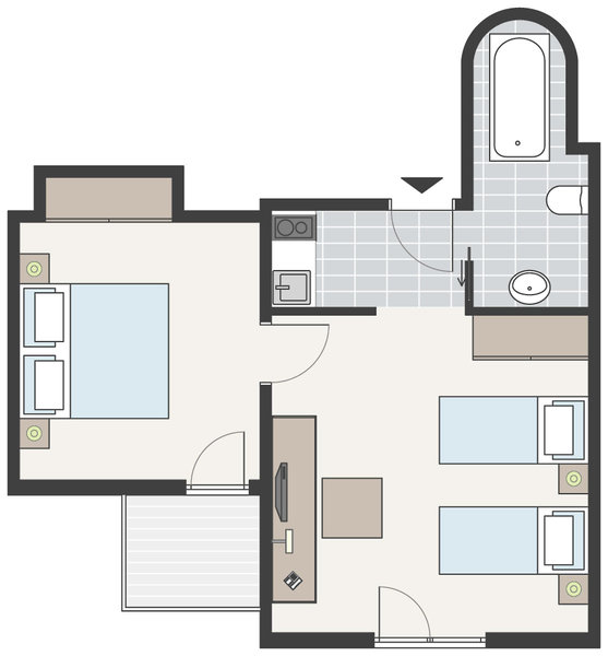 Standard Familienzimmer (2 Schlafzimmer): Minibar (geg. Geb.). Handtücher. TV, Telefon, Internet (geg. Geb.), Safe (geg. Geb.). Bad, Föhn. Balk./Terr. Max. 4E.