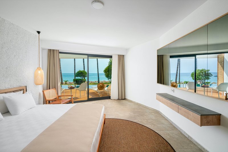 Doppelzimmer Meerseite: Die in hellen Farben dekorierten Zimmer bestehen aus einem Raum und sind mit Dusche/WC Minibar, Föhn, Split Klimaanlage, LED-TV, Telefon, Safe, wi-Fi, Kaffee/Tee Setup, ein Doppelbett oder zwei Einzelbetten sowie einem Sessel ausgestattet und liegen zur Meerseite mit Balkon (DY2). Wahlweise auch zur Alleinbenutzung buchbar (DY1).